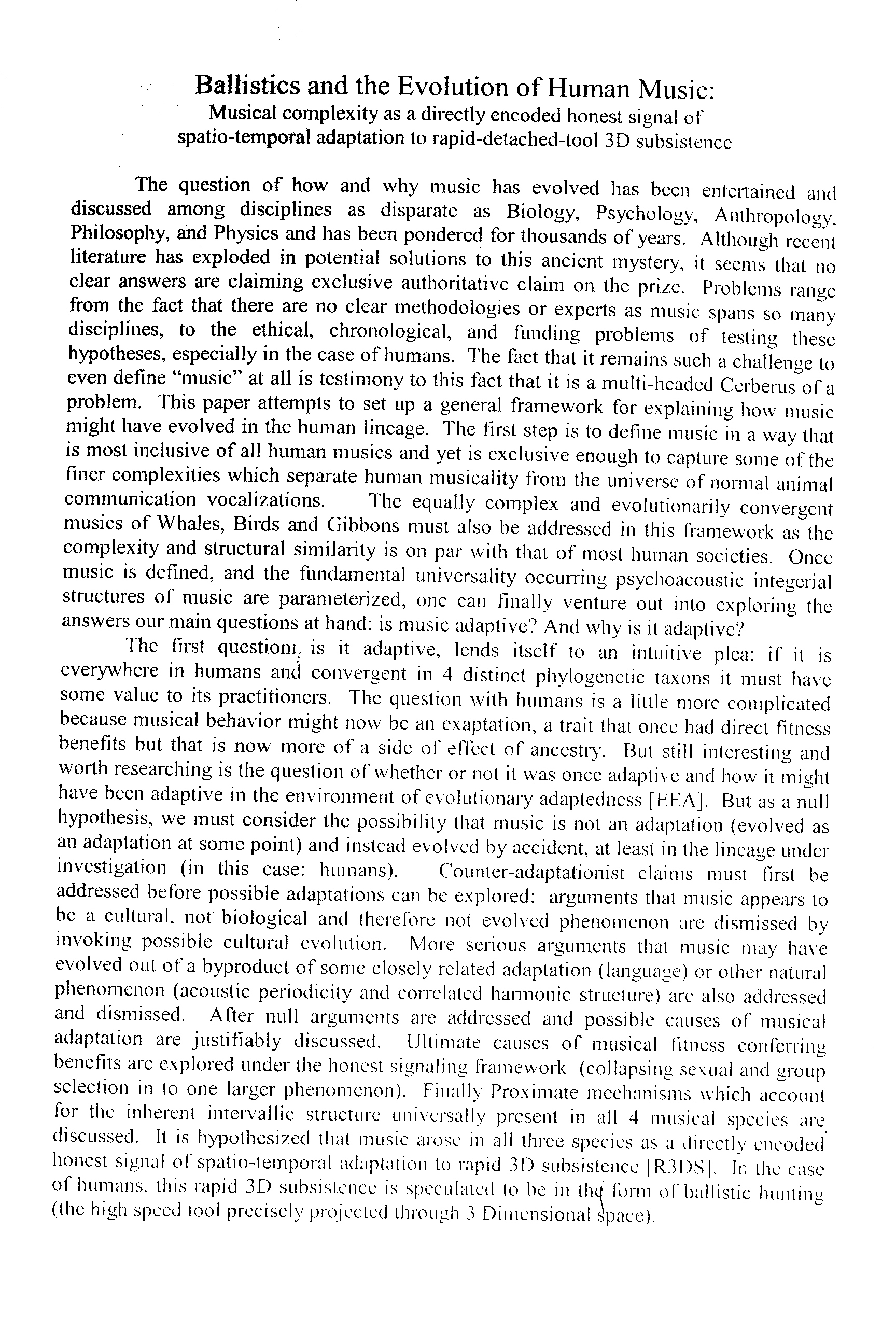 The first question is it adaptive, lends itself to an intuitive plea: if it is everywhere in humans and convergent in four distinct phylogenetic taxons it must have some value to its practitioners. The question with humans is a little more complicated because musical behavior might now be an exaptation, a trait that once had direct fitness benefits but that is now more of a side effect of ancestry. But still interesting and worth researching is the question of whether or not it was once adaptive and how it might have been adaptive in the environment of evolutionary adaptedness [EEA]. But as a null hypothesis, we must consider the possibility that music is not an adaptation (evolved as an adaptation at some point) and instead evolved by accident, at least in the lineage under investigation (in this case: humans). Counter-adaptationist claims must first be addressed before possible adaptations can be explored: arguments that music may have evolved out of a byproduct of some closely related adaptation (language) or other natural phenomenon (acoustic periodicity and correlated harmonic structure) are also addressed and dismissed. After null arguments are addressed and possible causes of musical adaptation are justifiably discussed. Ultimate causes of musical fitness conferring benefits are explored under the honest signaling framework (collapsing sexual and group selection into one larger phenomenon). Finally, proximate mechanisms which account for the inherent intervallic structure universally present in all four musical species are discussed. It is hypothesized that music arose in all three species as a directly encoded honest signal of spatio-temporal adaptation to rapid 3D subsistence. In the case of humans, this rapid 3D subsistence is speculated to be in the form of ballistic hunting--the high speed tool precisely projected through three dimensional space.